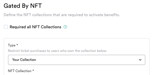 Unlike tickets or membership passes, eligibility to claim a benefit must be determined by ownership of an NFT within specified collections (i.e gating is mandatory.) Benefits can additionally be gated via email and wallet.