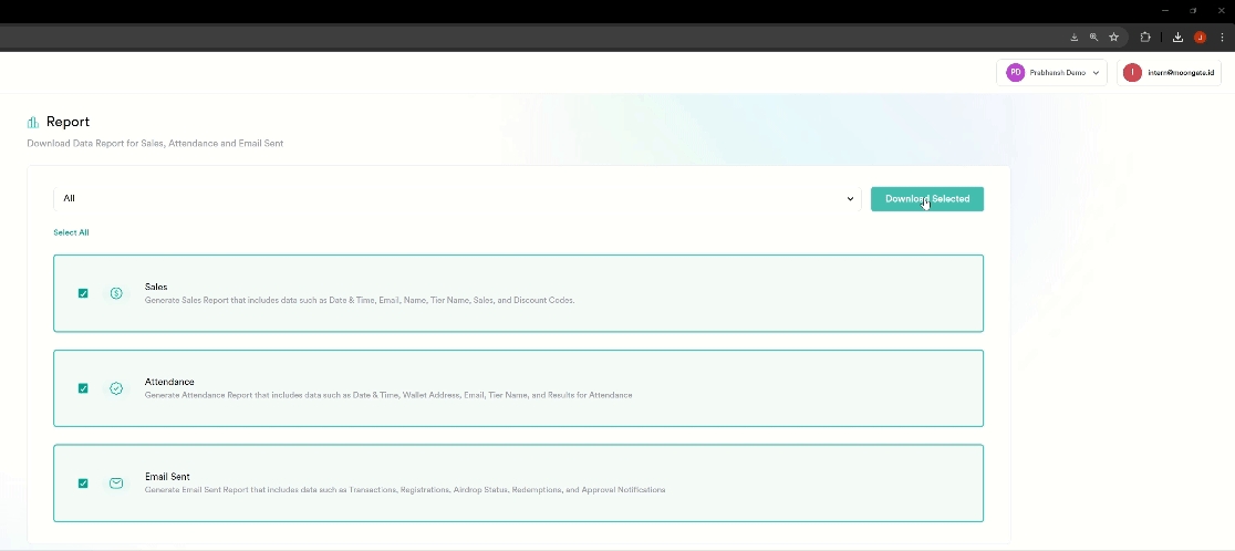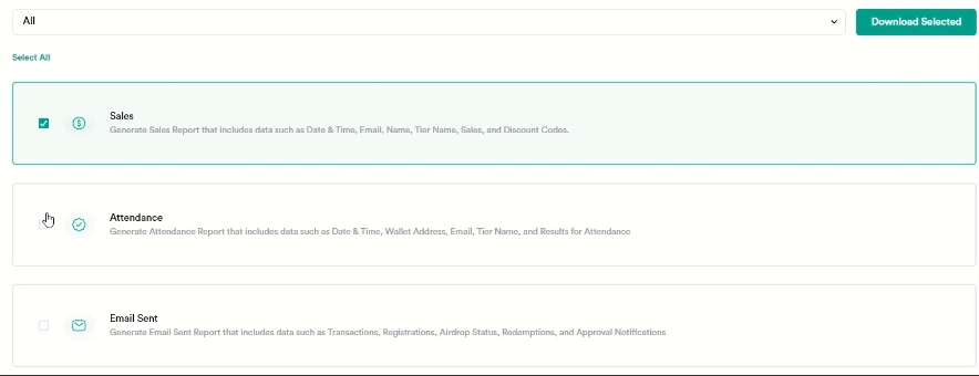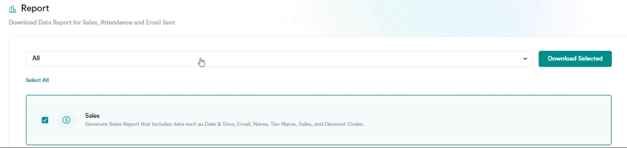 Choose the type of report you want to generate. You can select one or multiple options from Sales, Attendance, and Email Sent by checking the corresponding boxes.
