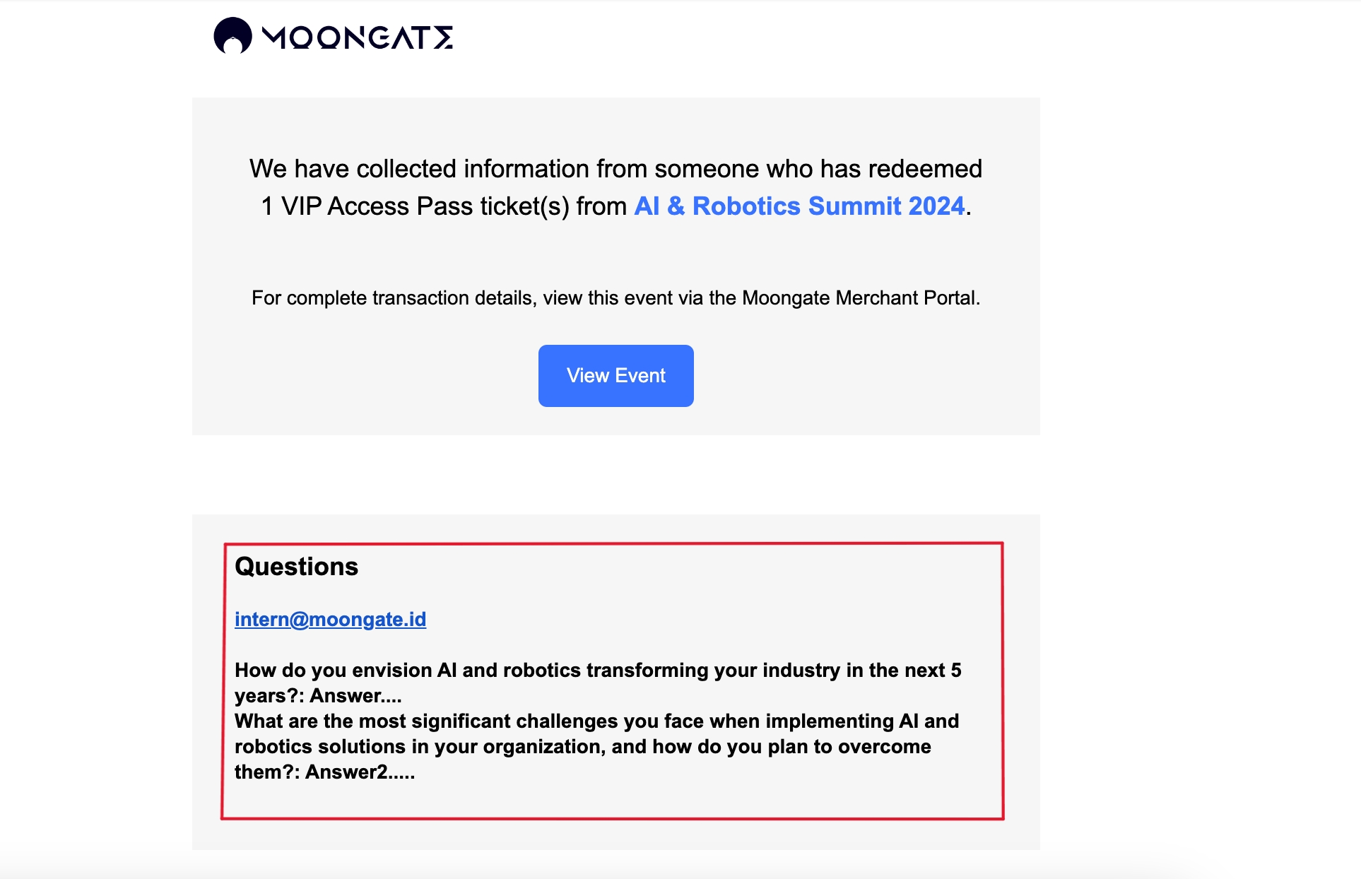 Email will be received by the organizer with the responses to the custom questions provided by the participants during the registration process.