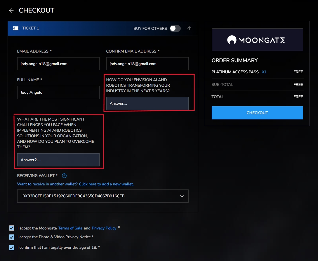 User will be asked to fill in the custom questions in order to proceed to checkout.